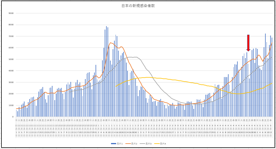 東京都と大阪府と全国の新規感染者数の推移のグラフを並べて見る。