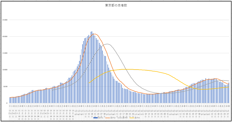 ところで新型コロナの東京都の新規と現在の患者数の昨日までの推移。東京都の現在患者数のデータはいつも夜中に調整されてやや減るのでその前のデータ。今朝確認したらその28日の患者数データ情報が無くなってしまっていたので調整前のままに。