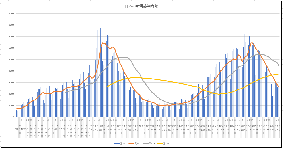 同じく5日(土)までの日本の新規と現存患者数の推移。