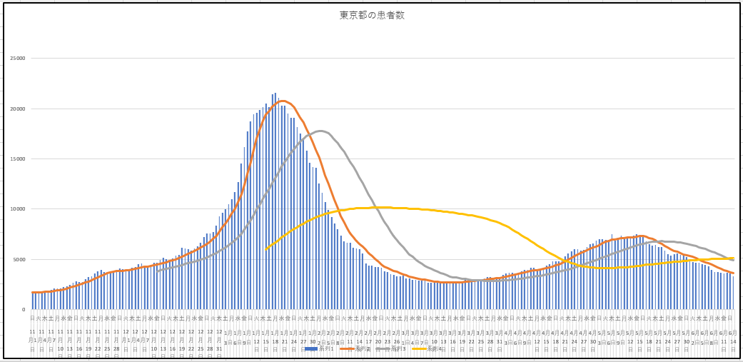 新型コロナの感染がさすがの月曜でかなり減ったので載せておきましょう。14日までの東京都の新規と患者数推移。