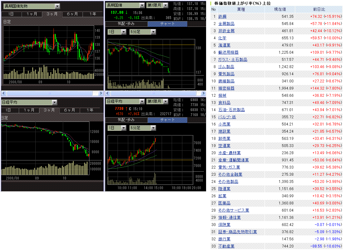 米株安に加えてメガバンクが引き続き売られたこともあり、日経平均は前場に7000円割れを記録しましたが、後場に入るとモリモリと上昇し大幅反発となりました。先物が強かったです。個別銘柄は、鉄鋼、非鉄、海運など景気敏感株が値を飛ばし、JFEHD、東海カーボン、日産化学などストップ高になる銘柄も多かったです。裁定買いにより値嵩ハイテクも強かったです。アジア株も、香港と韓国は大幅高(香港:+14.3% 韓国:+5.57%)となりました。