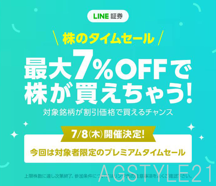 最大7%OFFで株が買えるLINE証券の「株のタイムセール」、前回6月10日に続いて次回は早速7月8日(木)に開催されるようです。