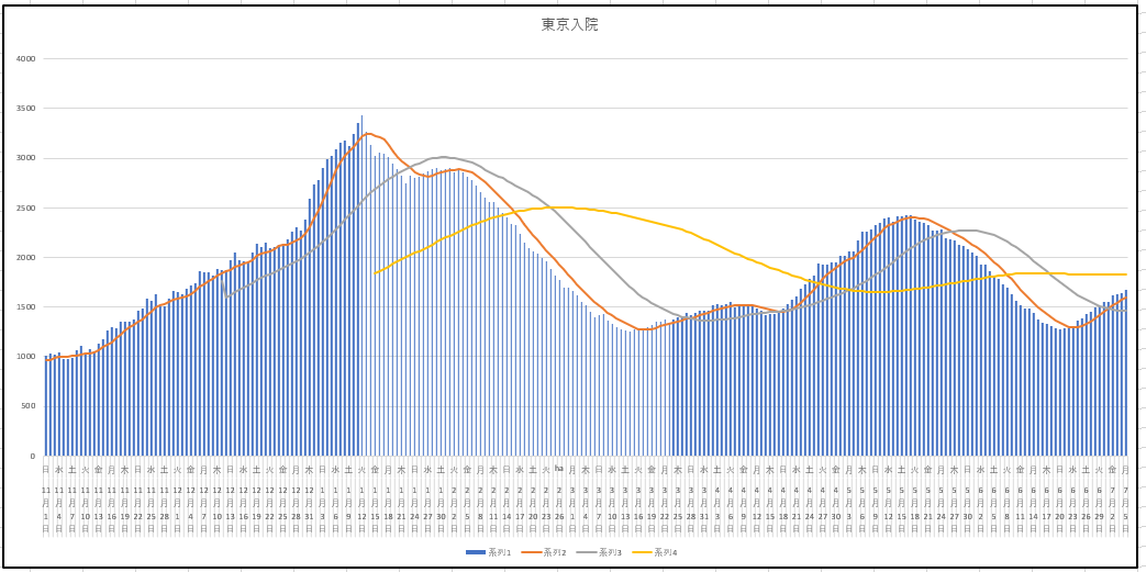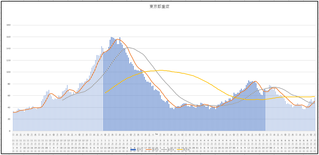 東京都の入院者数と重症患者数。東京都の場合の重症とは人工肺などの装置をつけているひとのこと。あと中軽含めた現存患者数データは夜中に更新があるので、そのあとに。