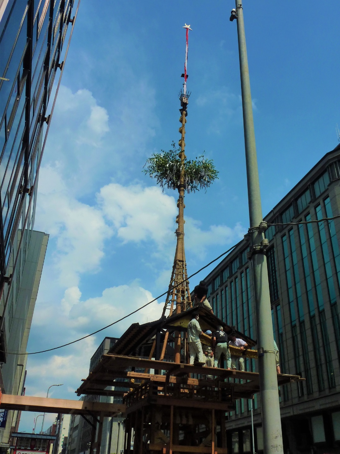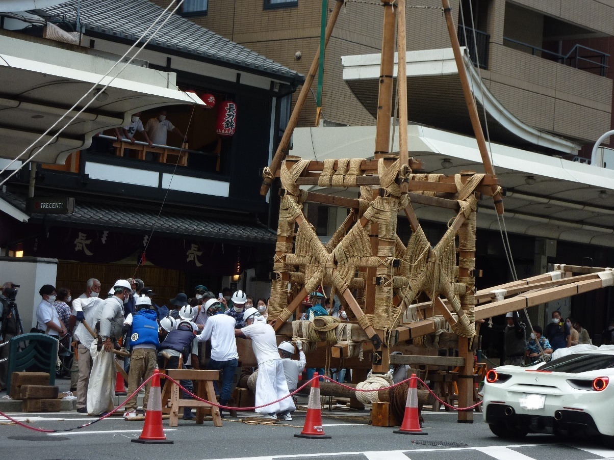 昨日、四条烏丸を通りかかると山鉾を組み立てていました