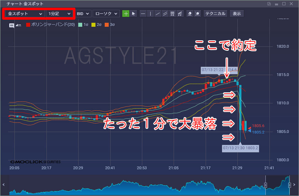 私の判断で購入した金スポットは、私が買うと同時にそれまで調子よく高騰していたものが止まり、レンジ相場に入ったようです。