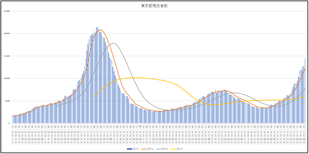 7月27日(火)までの東京都の新規、現存患者数、入院者数。