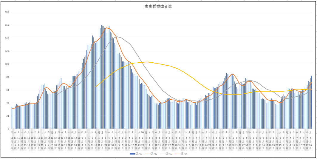 いったんは下降線になりつつあった重症者も上昇になってしまった。27日までの東京都の重症患者数。東京都の重症者は人工肺などの装置を着けている数だ。