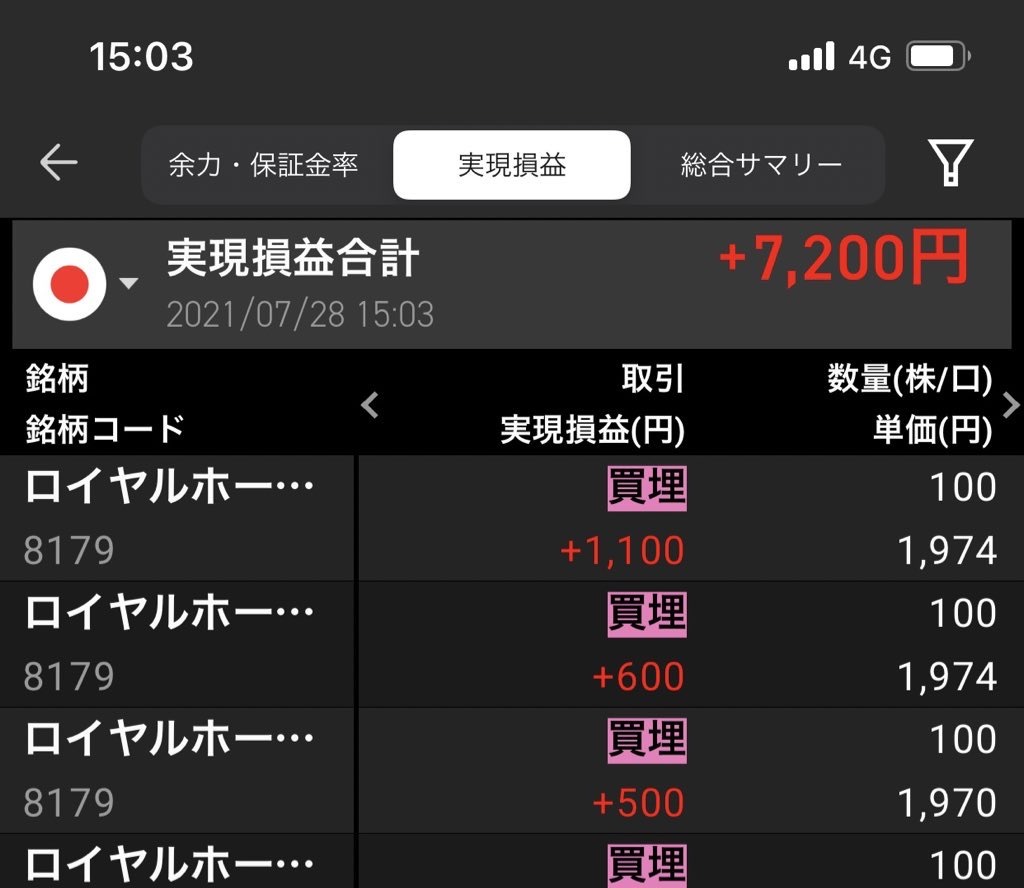 空売り、7/28の実現損益は+7200円