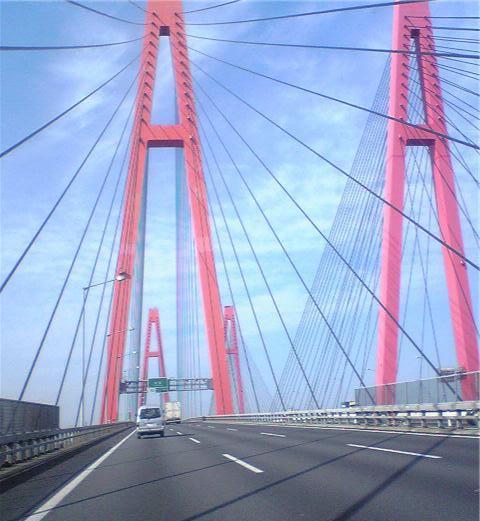 伊勢湾岸道の橋のひとつです、ここは名港トリトンといって3っの綺麗な大橋がかかり綺麗です、特に夜景はすごいです。御在所山のロープウエーから見た紅葉です。頂上はもう終わりです。下の竹細工は霧氷が綺麗にできるように作られているようです。国道が大水で流されて大変だったみたいです。まだ不通のとこが多いです。道路はすごく混んでいました。紅葉を見ながら待っていました。