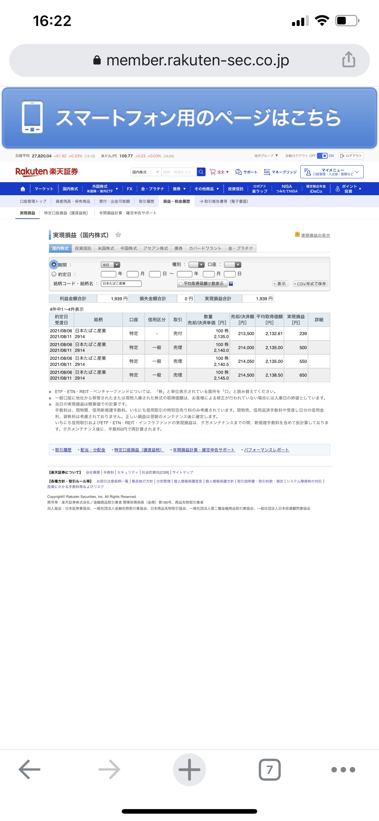 日本たばこ産業(2914)8/6の実現損益は+1939円