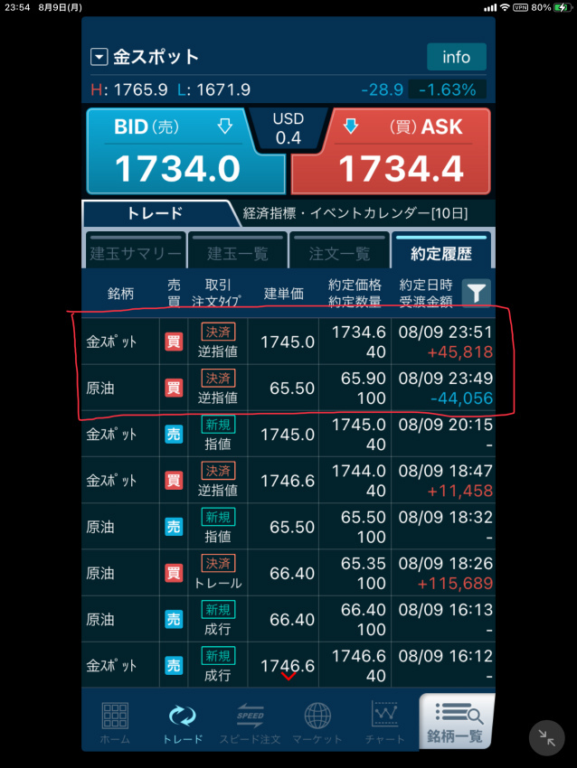 【原油・金CFD】空売り結果!