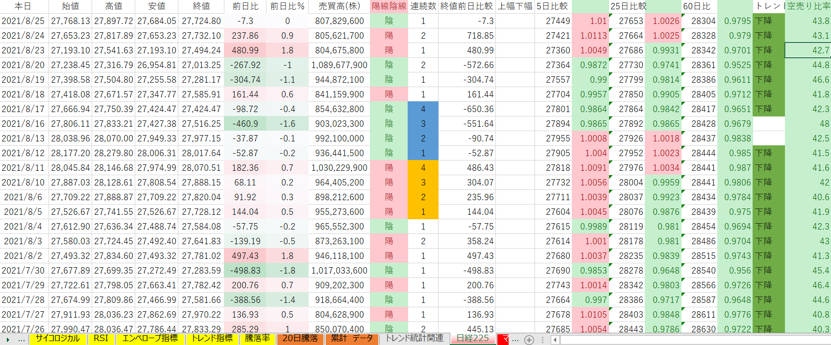 日経平均や日経先物のチャートを見てもらうと下降トレンド特有の現象が現れてます。