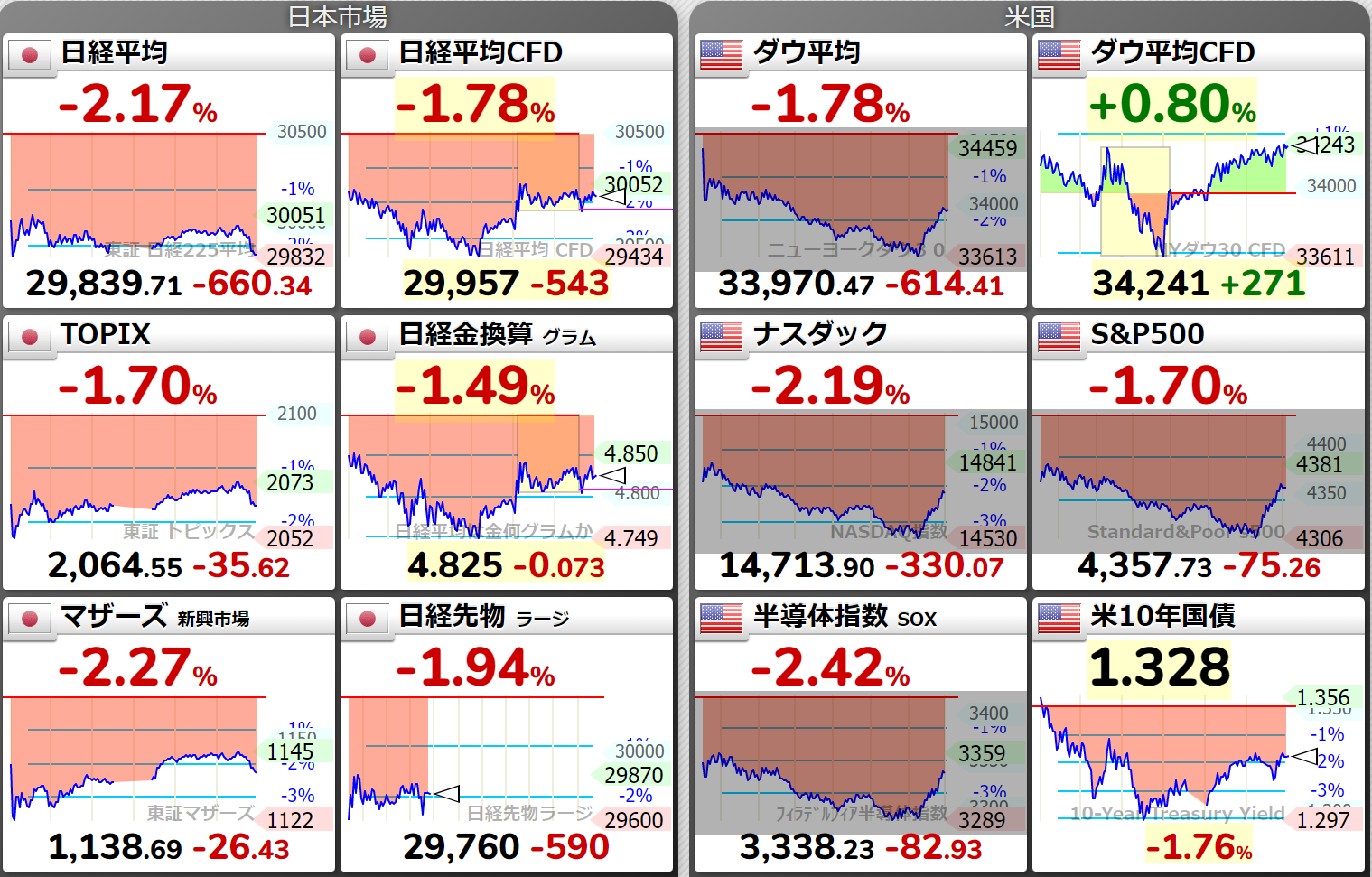 NYダウ 33970.47 -614.41 ( 9月20日) 米国10年国債利回り 1.311 %
