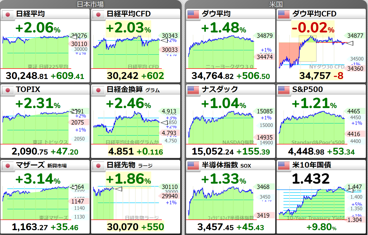 NYダウ   34764.82 +506.50 ( 9月23日) 米国10年国債利回り 1.433 %