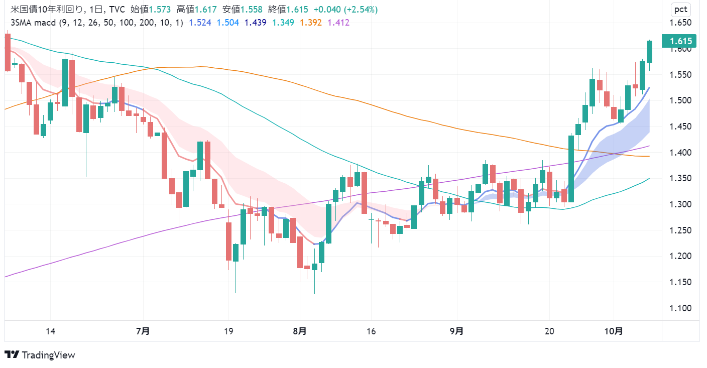 私は8月末にほとんどの米国株を売り払って以降、手を出せていません。そしてまだしばらく様子見をしようと思っています。なぜなら米国株はまだ下がると思っているからです。大きな根拠は米長期国債金利の上昇です。米10年国債金利を見ておきましょう。TradingViewのチャートを添付します。これをみると明確に上がってきています。先週書いたように、FRBは瞬間的に買いオペを入れながら金利上昇を抑え、市場に慣らしながらゆっくり上げていくことを考えているようです。しかし、長期金利の上昇圧力は依然としてかなり強いようです。