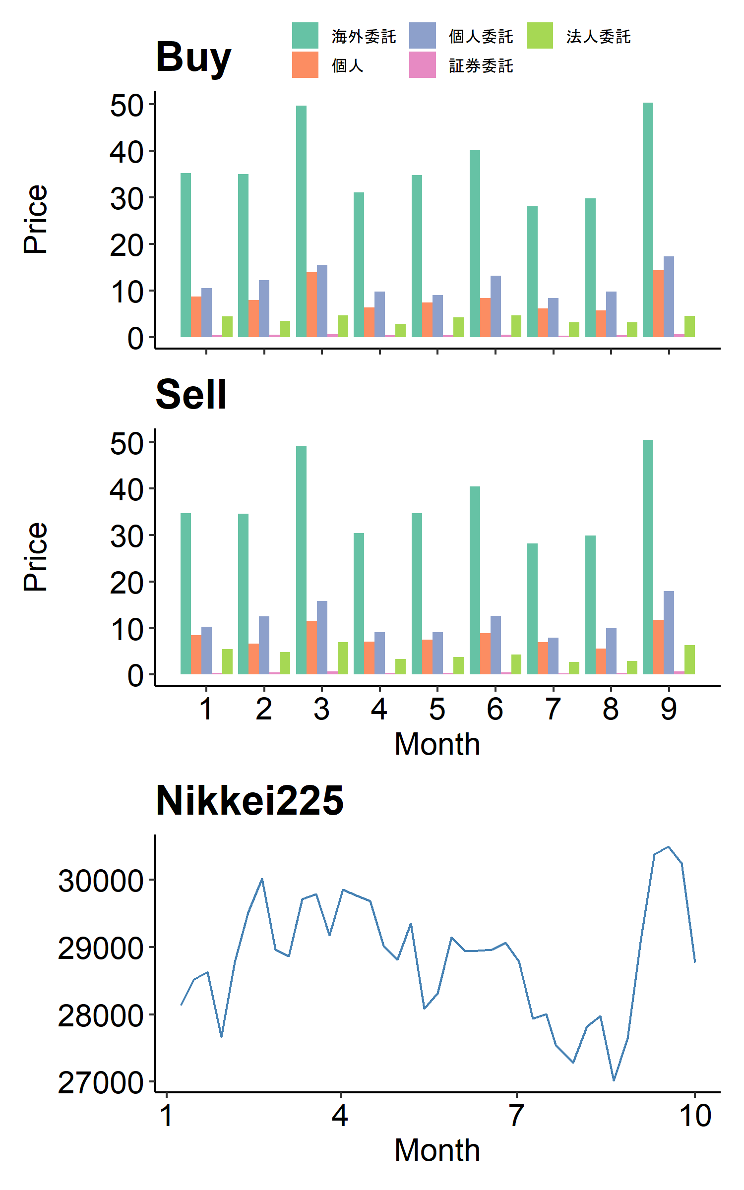 グラフを作成したので添付します。これは東証1部の取引額を月ごとに並べたグラフです。上から、買い、売り、日経225の週ごとのグラフになっています。金額の単位は兆円です。驚いたのは、海外投資家は金額ベースでみると全体の半分以上を占めている、ということです。私はこんなに多いと思いませんでした。せいぜい2割とかそんなものだろうと思っていましたが、まったく違いました。こんなに多ければ、日経株価に影響するのは当然ですよね。