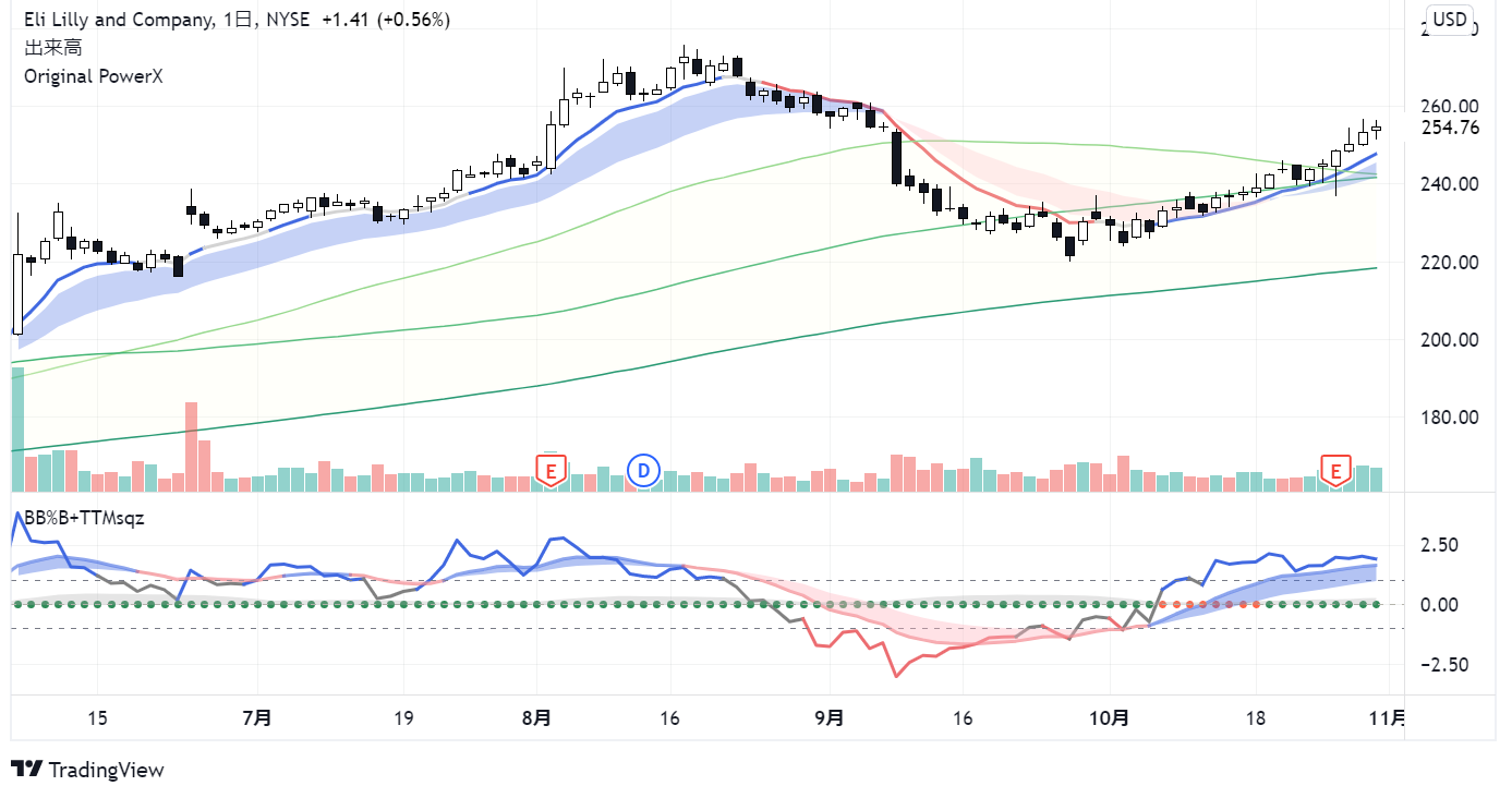 TradingViewを使って、いろいろとインジケーターをいじったりしています。いろいろとてんこ盛りになってきました(笑 でもわりと気に入ったものができたので満足です。イーライリリー( $LLY )が面白いチャートになっています。チャートを添付します。