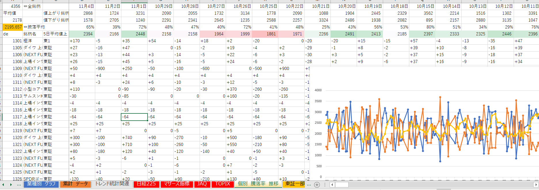 ※月間50%の法則とは、東証全体の日別値上がり銘柄比率の合計が50%付近になることです。