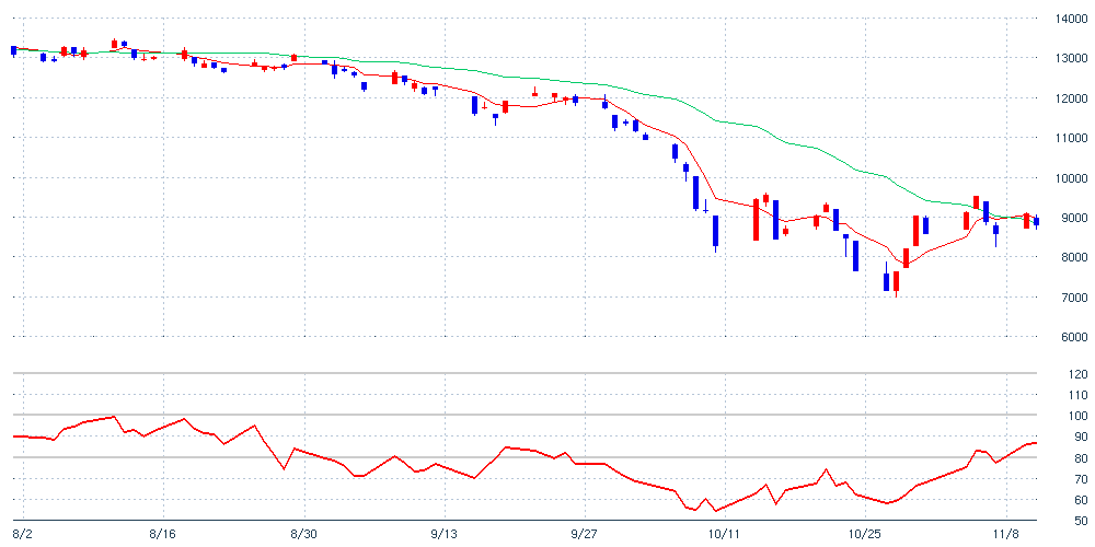 今は25日線に頭抑えられていて、移動平均線に沿って上値を切り下げながら徐々に下げて行くように思いまする。25日線が¥9,000を割り込んで来ているので、今週下がったとしてきちんと下げ止まるかどうかが焦点でござりましょう。