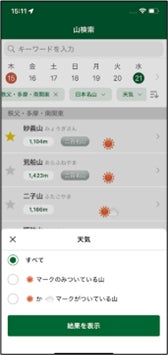 『晴れ山フィルター』機能は、これまでユーザーから多くいただいていた「晴れている山だけを知りたい」という要望を反映させたものであり、登山を趣味としている日本気象協会の職員からも要望が多かった機能です。