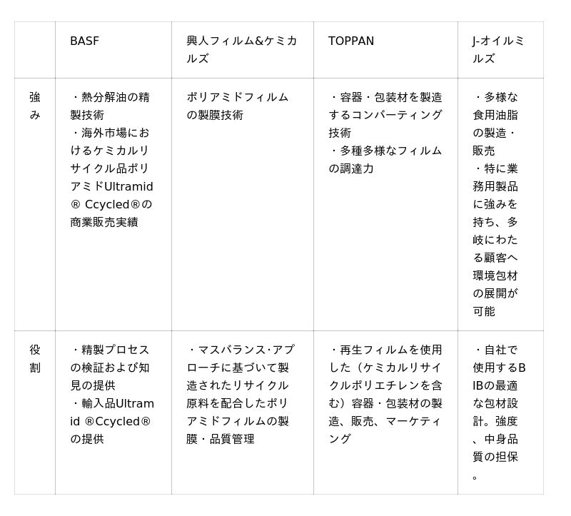 まず、BASFが、マスバランス・アプローチに基づきケミカルリサイクルしたポリアミドを生産します。興人フィルム&ケミカルズがこのリサイクル原料を配合したポリアミドフィルムを製膜し、TOPPANが容器(TL-PAK(R))を製造します。その後、J-オイルミルズがBIBの強度と中身品質の担保など最適な包材設計と検証を行います。