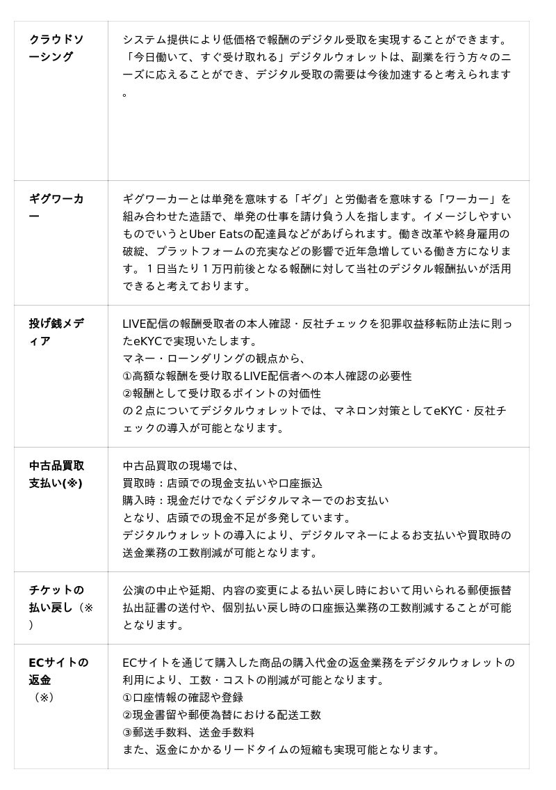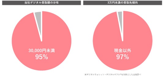 当社既存サービスでは、デジタルでの受取のうち約95%が3万円未満の少額であり、そのうち約97%のユーザーが現金以外の方法で受け取っています。