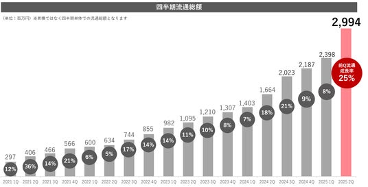 2025年9月期第2四半期においては前四半期対比125%、流通総額約30億円へ到達いたしました。流通総額1,000億達成に向けて、「3万円以下のto C現金支払い」を、1.広告領域 2.人材領域 3.金融領域の3軸にて網羅を目指してまいります。各領域における取り組みを強化し、2027年9月期に掲げている流通総額1,000億円を達成することで、圧倒的低手数料を実現し、より多くの企業様にご利用いただけるよう、更に邁進してまいります。
