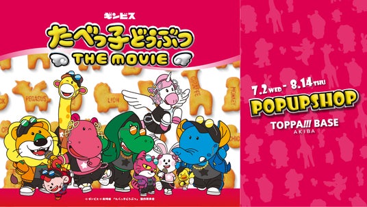 この度、「TOPPA!!! BASE AKIBA」の第三弾として、2025年7月2日(水)から8月14日(木)までの間、2025年5月1日より公開された映画『たべっ子どうぶつ THE MOVIE』とのコラボレーションを実施します。本作品は、1978年の発売開始より長らく愛され続けるおかし「たべっ子どうぶつ」でお馴染みのどうぶつたちを3DCGアニメーションで映画化した作品で、観客動員数54万人(※1)を動員する大ヒット作品となっています。また、映画版で登場した3DCGの愛らしいキャラクターデザインは、ファンの間で人気を博しています。この度、「TOPPA!!! BASE AKIBA」では、『たべっ子どうぶつ THE MOVIE』のファンの声にこたえ、映画版オリジナルの3DCGキャラクターなどをモチーフとした描き下ろしデザインのオリジナルグッズや、デジタルフォトブースなどを提供するほか、本店舗ECサイトでもグッズを販売します。