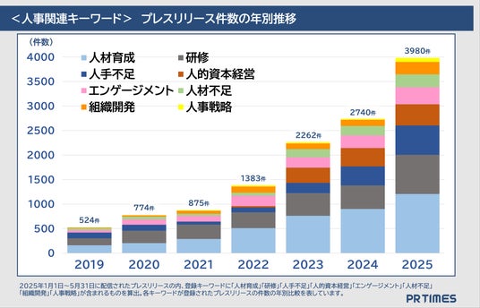 なかでも「研修」は2024年:482件、2025年:799件と前年同期比で1.6倍以上に伸びています。この傾向をけん引しているのは、研修プログラムや支援サービスを展開する企業による発信です。新たな研修メニューの提供開始や導入実績を伝える発表が多く見られ、企業の人材不足対策に伴う投資を見込み、支援サービス事業者による情報発信が活発になっています。