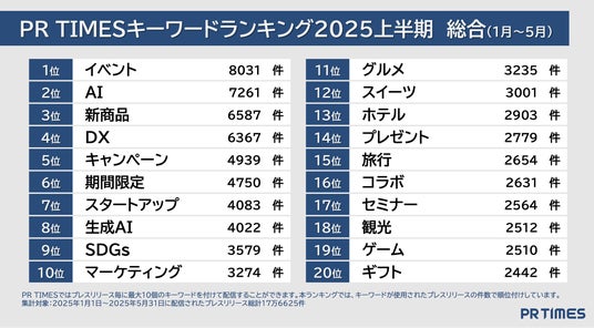 「PR TIMES」ではプレスリリース発表の際に、発表企業がプレスリリース内容に関係するキーワードを最大10個登録することができます。2025年1~5月に発表された総計17万6625件のプレスリリースのキーワード登録総数は27万2895種に上りました。件数による順位だけでなく、過去の件数との比較や月別の推移、キーワードごとの詳細な発表内容の分析から、2025年の企業活動の潮流や企業動向の変遷と流行の兆しをキーワードを通して分析しています。
