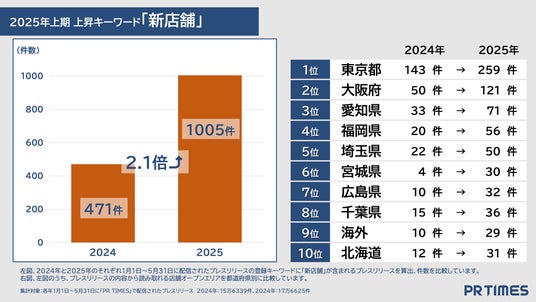 2025年1月~5月に配信された「新店舗」キーワード付きプレスリリースは前年同期比で約2.1倍となり、過去最多を記録しました(2024年:471件→2025年:1005件)。発信件数の伸びは、都市部の再開発・地方都市での施設刷新・インバウンドや外需を見据えた越境展開といった複数の社会的潮流が重なった結果と見られます。