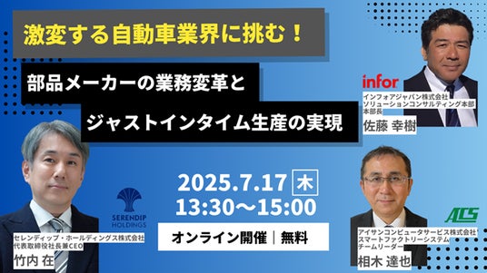 セレンディップ・ホールディングス株式会社(本社:名古屋市中区、代表取締役社長兼 CEO:竹内 在 以下、当社)は、2025年7月17日(木)にオンラインにて開催されるインフォアジャパン株式会社主催の製造業向け無料オンラインセミナー「激変する自動車業界に挑む!部品メーカーの業務変革とジャストインタイム生産の実現」に参加いたしますので、下記の通りお知らせいたします。