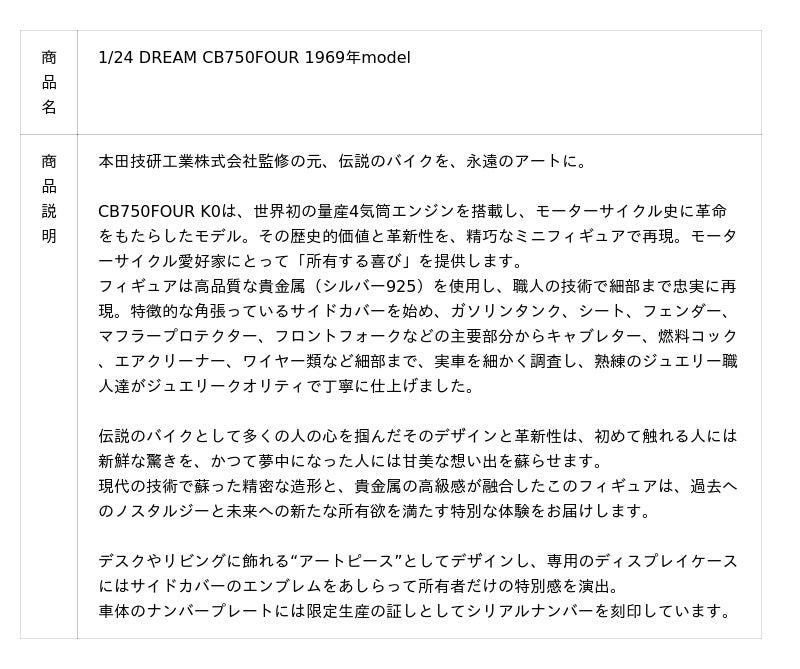 【Honda】”ナナハン”の代名詞「CB750FOUR」1969年モデルの1/24サイズ シルバー製フィギュア。ナンバープレートにシリアルナンバーを刻印