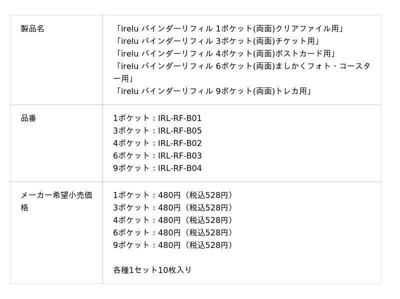 「irelu バインダーリフィル」シリーズに新たに追加される5タイプは、「1ポケット(両面)クリアファイル用」、「3ポケット(両面)チケット用」、「4ポケット(両面)ポストカード用」、「6ポケット(両面)ましかくフォト・コースター用」、「9ポケット(両面)トレカ用」の計5種類です。高透明素材と白台紙の組み合わせでコレクションをより美しく見せることが最大の特徴です。台紙には透け感の少ない白台紙を採用しているので、特に最近多いクリア素材のグッズを収納する際に活躍します。