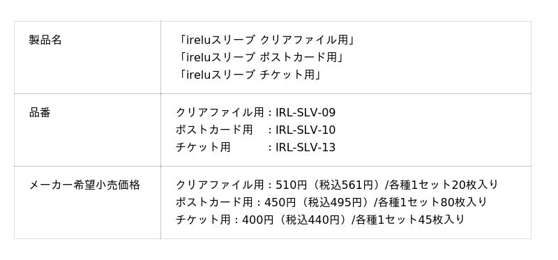 同時に発売される「irelu スリーブ」シリーズには、「クリアファイル用」「チケット用」「ポストカード用」の3種類が発売されます。いずれもグッズに適した厚みを考慮し、高透明のOPP素材を使用することで、グッズの色彩や細部を損なうことなく保護します。