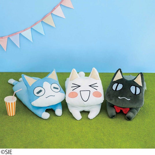 トロ、クロ、ソラの3匹のかわいく見える姿にこだわった、もちもちわた入りのクッションです。