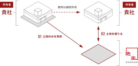 所有する不動産の土地のみを売却頂くと同時に、当社から土地をお借り頂きます。事業運営環境は変わらず、売却手続きの手間もかからず、資金調達や財務状況の改善が図れる、新しい手法です。