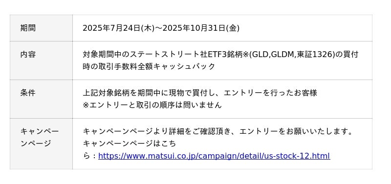 松井証券株式会社(本社:東京都千代田区、代表取締役 社長執行役員:和里田 聰、以下「当社」)は、ステート・ストリート・インベストメント・マネジメントの提供するゴールドETF3銘柄(GLD、GLDM、東証1326)について、現物買付手数料をキャッシュバックするキャンペーンを実施します。