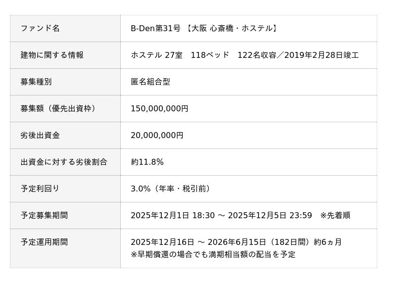 本リリースでは、今回のファンドの概要、そして安定した資産運用を目指す投資家の皆様に向けたB-Denのポイントをお知らせいたします。