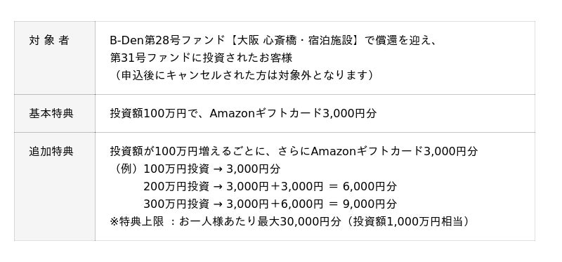 B-Den第28号ファンドに続き、配当(※1)とは別に、Amazonギフトが獲得できる2つのキャンペーンを実施いたします。(※2)