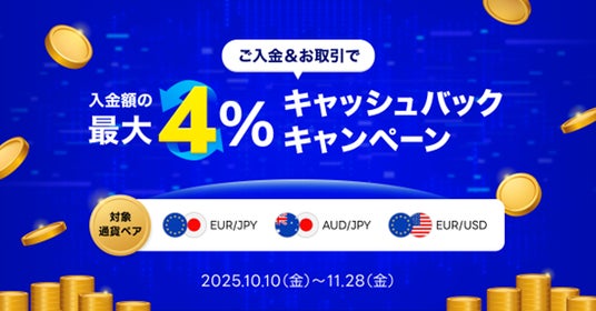 このたび、ユーザーへの日頃の感謝の気持ちを込めて、「ご入金&お取引で最大4%キャッシュバックキャンペーン」を2025年10月10日(金)から11月28日(金)まで開催します。キャンペーン期間中、入金額、および対象の通貨ペアの新規取引数量の合計に応じて、キャッシュバックいたします。