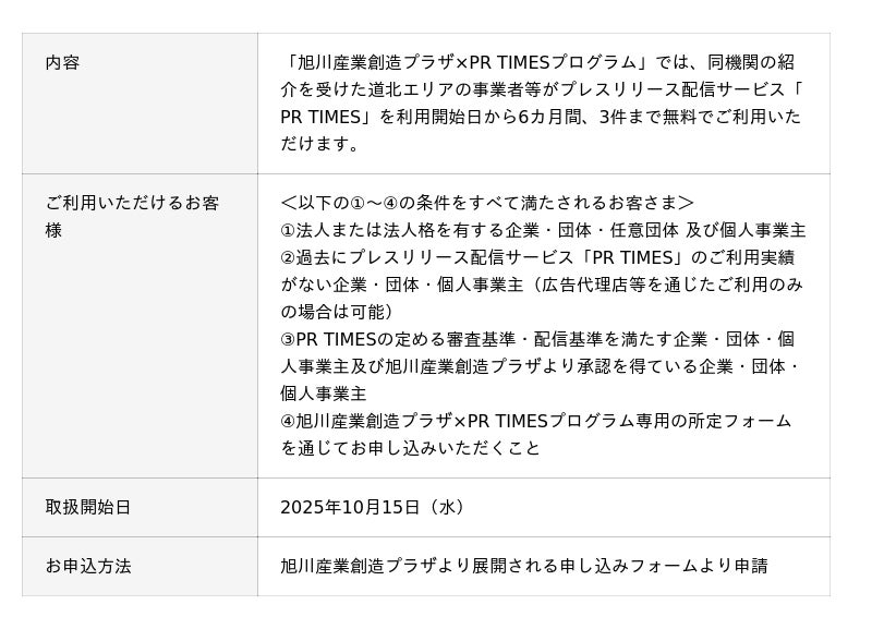 旭川産業創造プラザ×PR TIMESプログラムの提供道北エリアの事業者の情報発信を支援するため、対象企業へプレスリリース配信を一定条件下で無償とするプログラム(詳細は下記参照)を提供いたします。本プログラムを活用し、道北エリアに拠点を構える事業者等がプレスリリースを配信し、ステークホルダーに対して新たな情報接点を創出する支援をおこなってまいります。