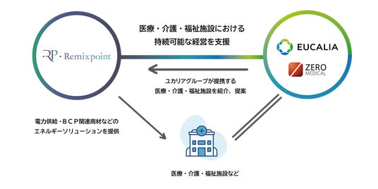株式会社リミックスポイント(証券コード:3825、本社:東京都港区、代表取締役社長CEO 高橋 由彦、以下「当社」)は、医療・介護・福祉施設における経営課題の一つである電力コストの最適化と、BCP対策の推進を目指し、株式会社ユカリア(本社:東京都千代田区、代表取締役社長:三沢 英生、以下「ユカリア」)、ユカリアの子会社である株式会社ゼロメディカル(本社:東京都港区、代表取締役:原 征弘、以下「ゼロメディカル」)との業務提携契約を締結いたしました。