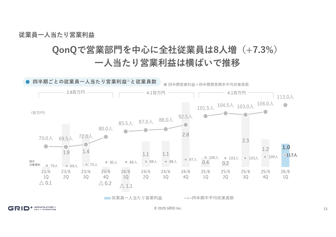従業員1人当たり営業利益について、営業を中心に全社従業員が8名増加しましたが、1人当たりの営業利益は100万円とほぼ横ばいを維持しました。