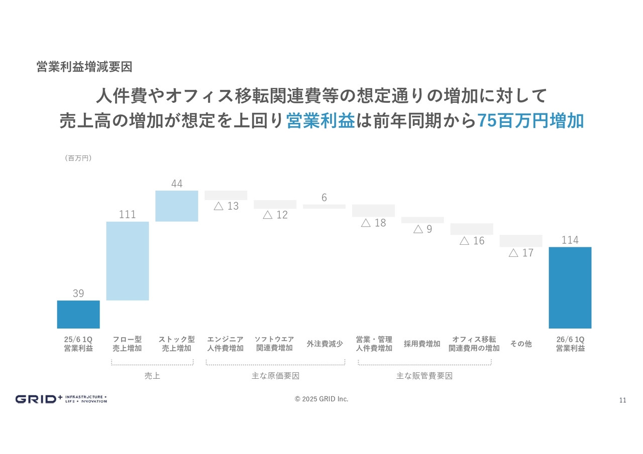 前年同四半期と比較した際の営業利益の増減要因について、前年同四半期から従業員が11名増加したことに伴い、人件費は3,100万円増加しました。また、計画に織り込み済みのオフィス移転関連費用が1,600万円発生しています。