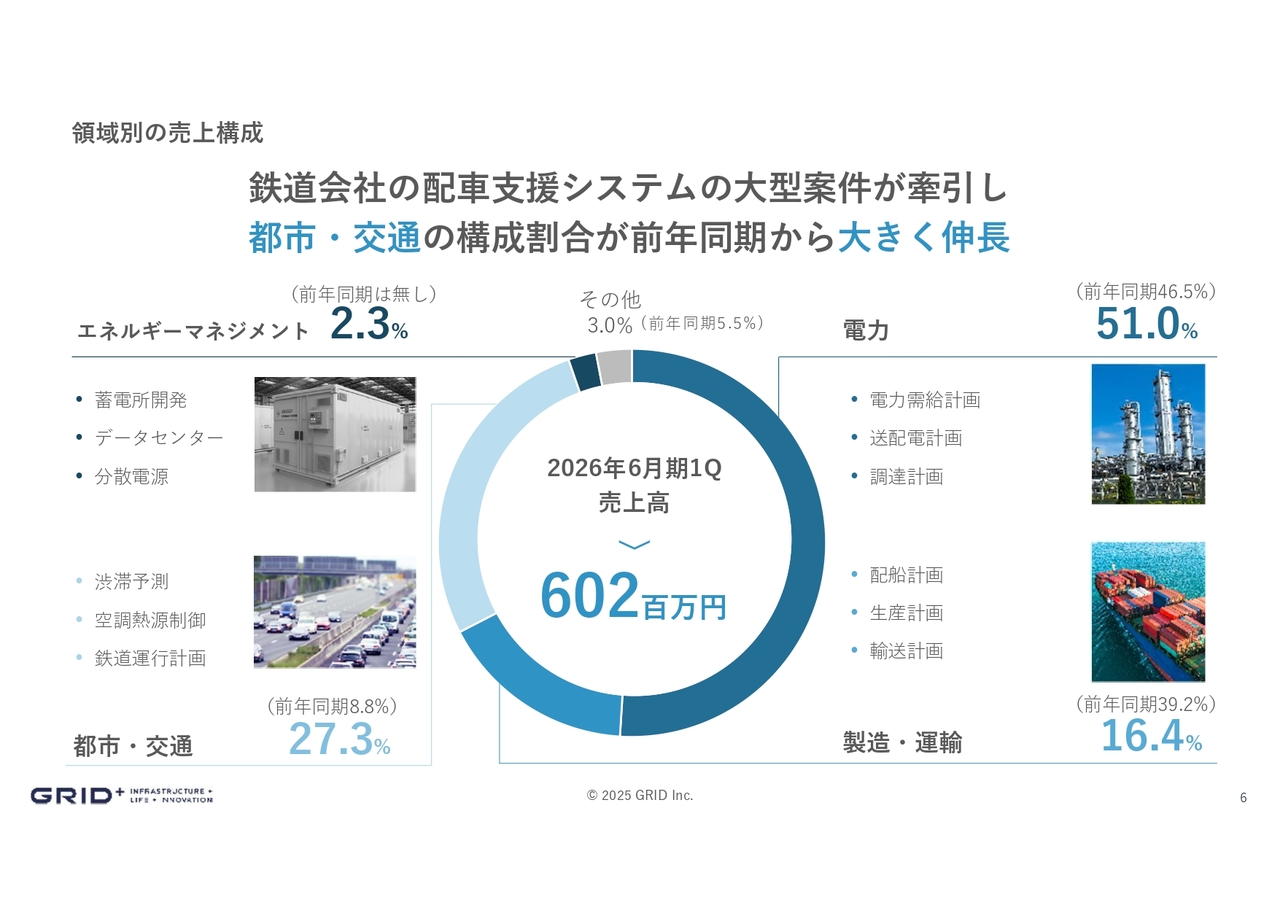 領域別の売上構成比率について、都市・交通領域は、鉄道会社向けの配車計画や修繕計画の最適化プロジェクトが進展したことにより、売上構成比率は27.3パーセントとなり、前年同四半期から18.5ポイント増加と大きく伸長しました。