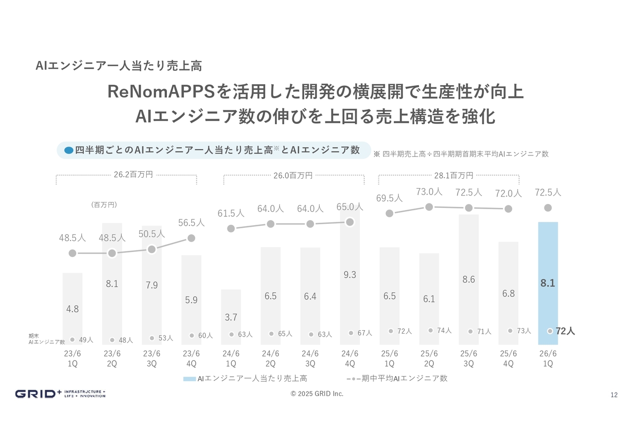 AIエンジニア1人当たりの売上高について、エンジニア数が横ばいの中、売上が増加した結果、1人当たりの売上高は810万円と前第4四半期から増加しました。