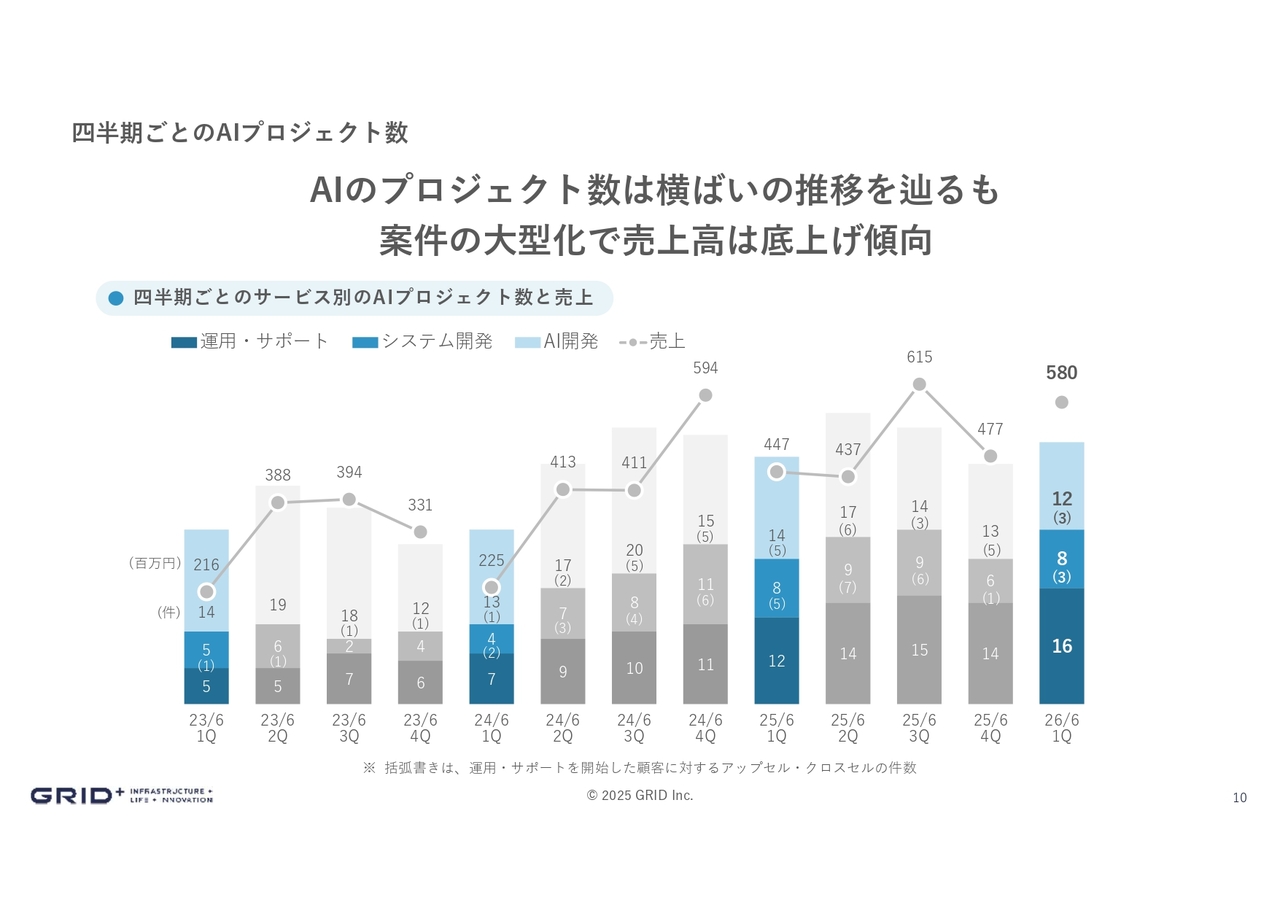 四半期ごとの全体のAIプロジェクト数は、横ばいながらも、売上については開発案件の大型化で前年同四半期から増加しました。