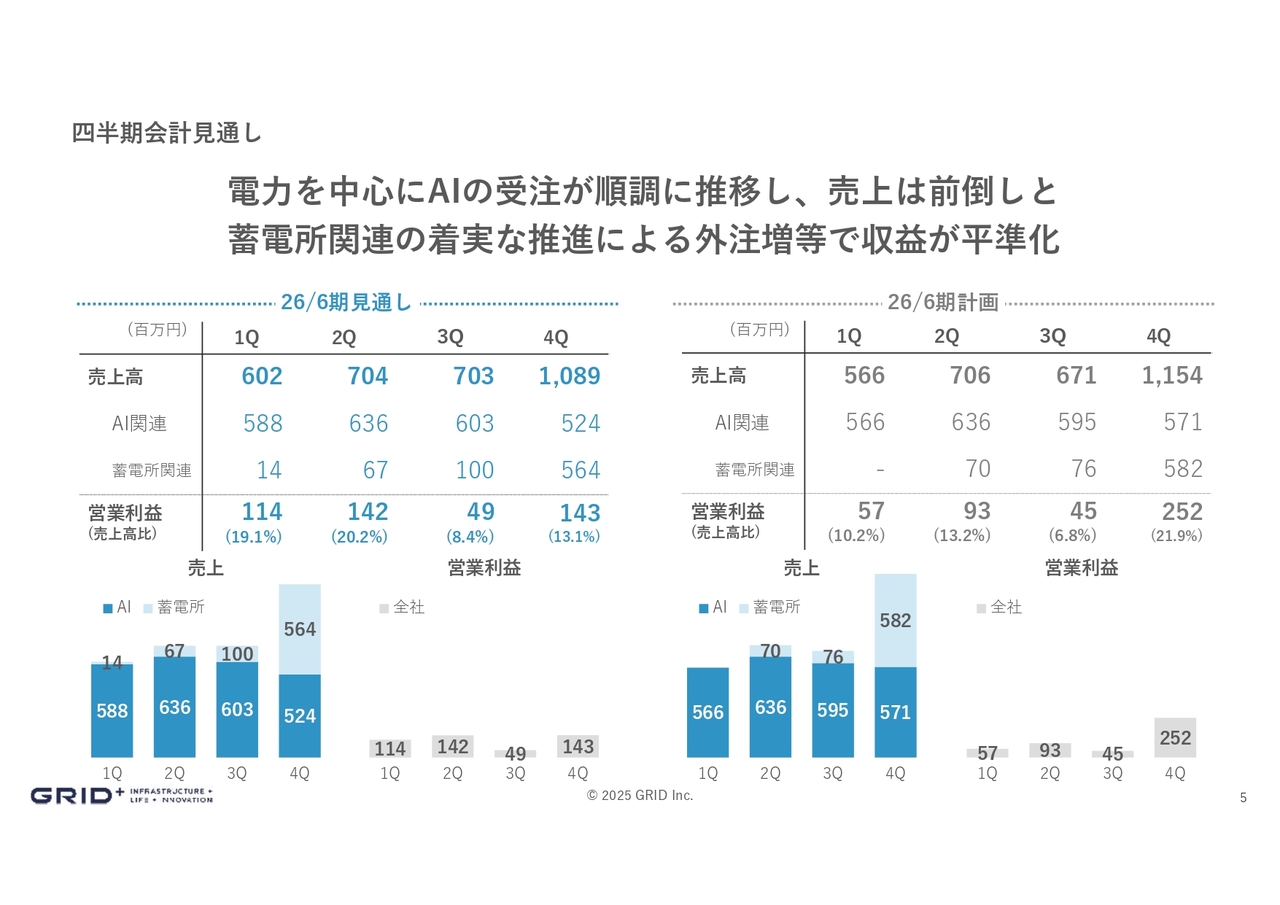 四半期ごとの見通しについて、AI関連の売上は順調に推移し、蓄電所関連の売上は四半期ごとに少しずつ拡大しながら、第4四半期に大きく伸長する見込みです。