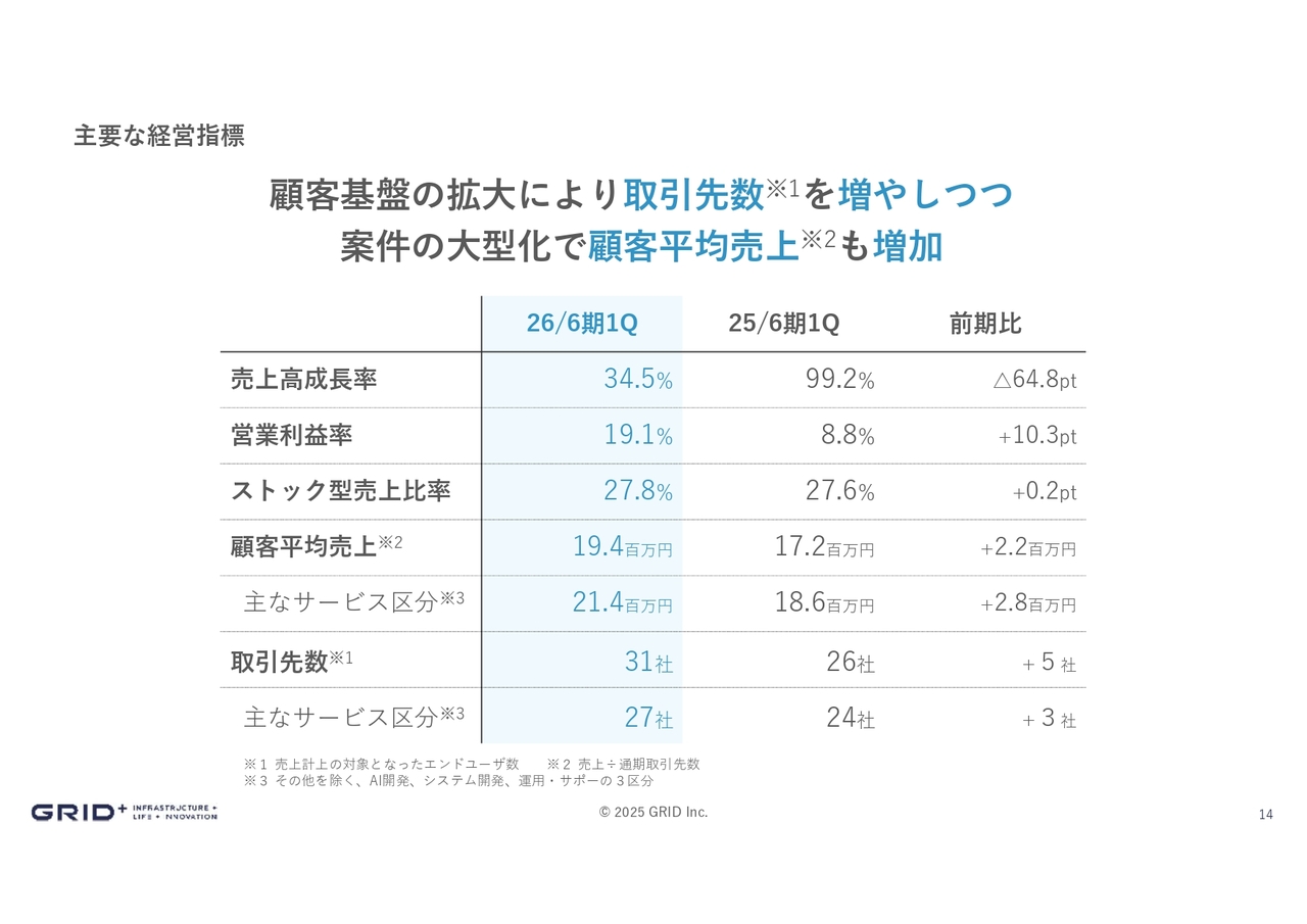 主なサービス区分の顧客平均売上は2,140万円と前年同四半期から280万円増加しており、取引先数と顧客平均売上ともに増加となりました。